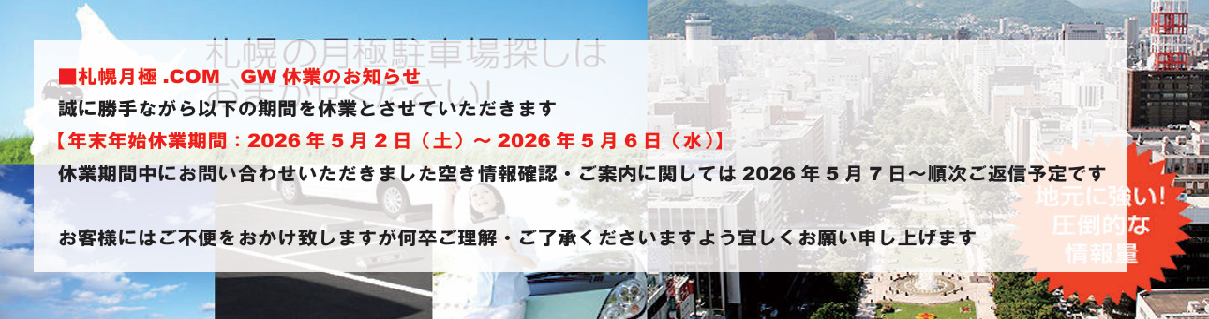 月極駐車場検索サイト【札幌月極.com】は札幌市内不動産会社・駐車場管理会社の垣根を越え、約1700件の駐車場情報を掲載中!市内駐車場物件数NO.1の【札幌月極.com】なら、ご希望エリアの月極駐車場情報を検索出来ます。